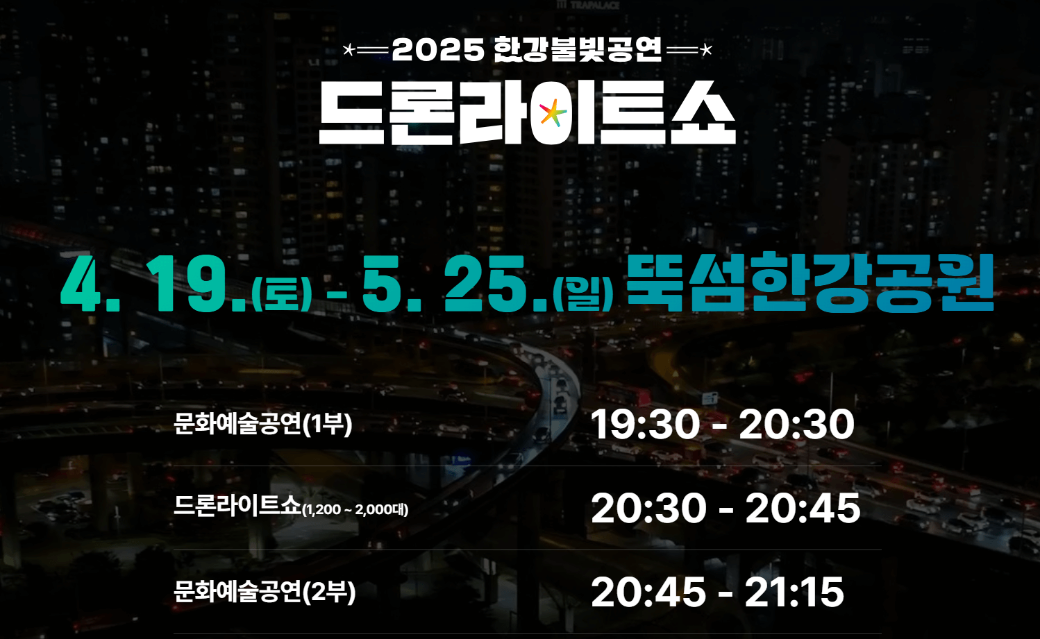 시간: - 1부 문화공연: 저녁 7시 30분 ~ 8시 30분, 2부 드론쇼: 밤 8시 30분 ~ 8시 45분